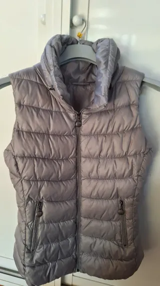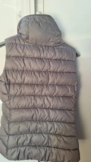 Chaleco acolchado de color gris. Es ligero y perfecto para añadir una capa extra de abrigo. - Cierre de cremallera frontal. - Dos bolsillos laterales con cremallera. - Cuello alto.