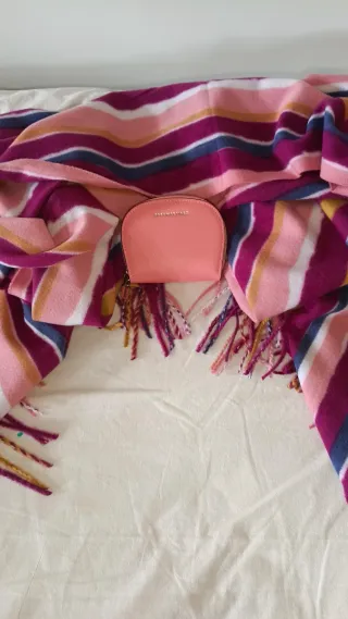 Conjunto de pañuelo y monedero a juego con un diseño de rayas vibrantes. El pañuelo tiene flecos en los extremos y el monedero es de un tono coral. - Cartera de PACO MARTÍNEZ. - Pañuelo SIN MARCA. - SIN USAR. - Diseño de rayas multicolor. - Monedero con cierre de cremallera.