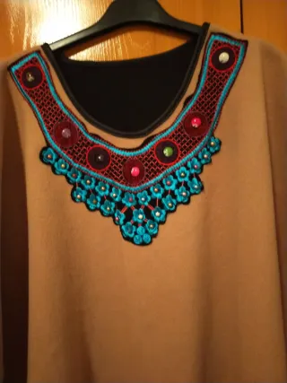 Preciosa capa o poncho de tejido suave en color beige. Destaca por su original y colorido adorno en el cuello. - Adorno bordado con pedrería y abalorios. - Ribete negro en todo el contorno. - Diseño amplio y cómodo.