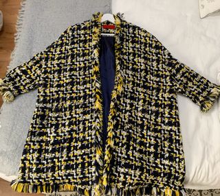 Poncho Carolina Herrera en colores azul oscuro, amarillo y blanco . Talla S Carolina Herrera pero vale para tallas L/XL Medida de sisa a sisa: 70 cm. Largo con flecos: 90 cm.