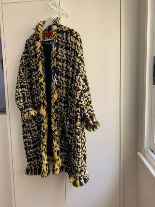 Preciosa capa de la marca Trinidad Castillo con un diseño vibrante y original. - Estampado de pata de gallo en rayas multicolores. - Cierre cruzado con botones rojos. - Corte amplio y cómodo.