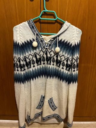 Abrigo o suéter tejido con un diseño andino llamativo. Es una prenda cómoda y versátil. - Diseño con figuras de llamas y patrones geométricos. - Cuello con cordones y pompón. - Bolsillos frontales con detalle de tejido. - Bajo y puños con borde decorativo.