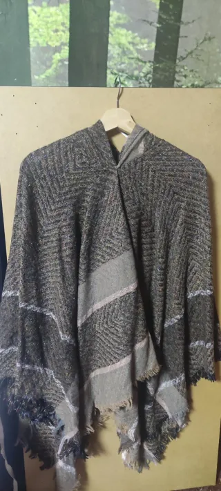 Capa de punto con un toque de hilo metálico que le da un brillo sutil. - Diseño de punto calado. - Tonos beige y dorado. - Talla M-L (mediano) - No tiene etiqueta por eso no he podido cambiar la talla. Esta nueva