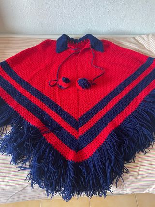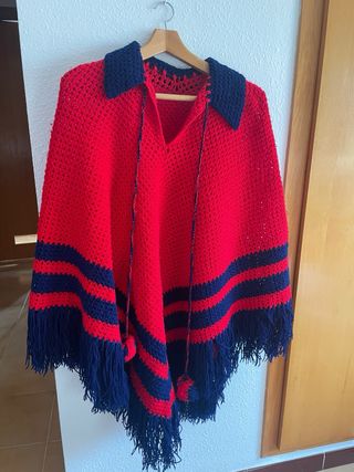Poncho tejido a mano con un diseño llamativo en rojo y azul. Perfecto para añadir un toque de estilo. - Cuello estilo polo. - Cordones con pompones. - Flecos largos en el bajo.