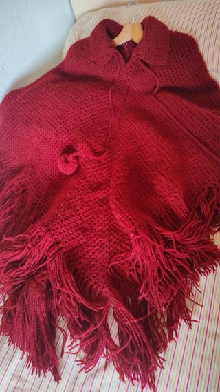 Poncho de lana tejido a mano, con un diseño inspirado en los años 80. Ideal para añadir un toque retro a tu estilo. - Tejido grueso y cálido. - Detalle de flecos largos en el bajo. - Cierre con cordón y pompones decorativos en el cuello.