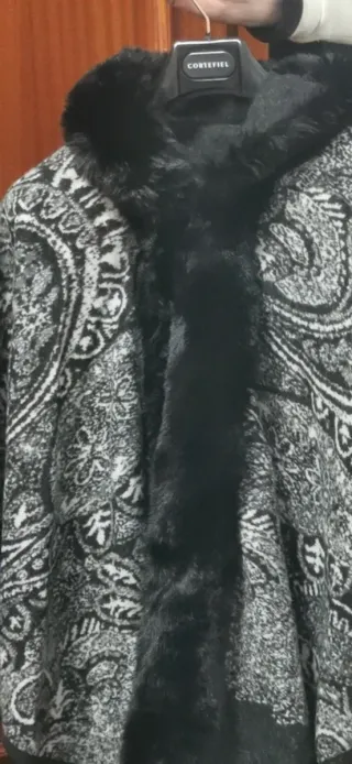 Preciosa capa con un diseño llamativo y detalles de pelo. - Estampado paisley en blanco y negro. - Ribete de pelo sintético negro en capucha y mangas. - Diseño abierto tipo poncho. Venta en mano en Zaragoza