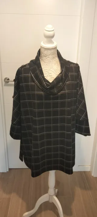 Capa con un diseño de cuadros en tonos negro y plata. Su corte es moderno y versátil. - Cuello tipo capa. - Mangas tres cuartos. - Detalle de botones en los hombros. Ver composición en la etiqueta.