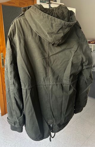 Abrigo de hombre en color gris degradado. Diseño clásico con múltiples bolsillos. Lleva borreguillo que se puede quitar y usar como parka menos abrigada entretiempo o poner borreguillo muy abrigado. Lleva una mancha desteñida en el pecho lado derecho (se ve en la foto) Parka hombre L muy abrigada, con opción de quitar la capa de borreguillo y hacerlo de menos abrigo. - Cuello alto con ajuste. - Cierre de cremallera y botones. - Muy abrigado.
