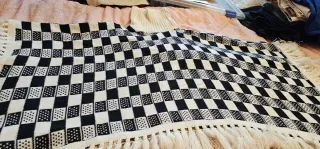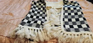 Capa de lana con un diseño geométrico en blanco y negro. Ideal para añadir un toque de estilo. -Largo 104cm -Ancho 80cm. - Diseño de rombos y formas tribales. - Acabado con flecos en el bajo.