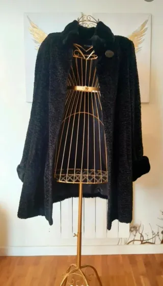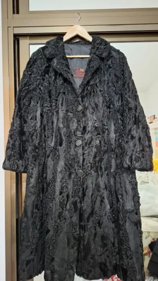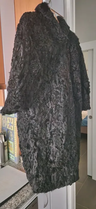 Talla 44-46 Abrigo negro de astracán, de peletería. Precio negociable. No se envía. Recogida en Bilbao, en Begoña o en medina de Pomar.