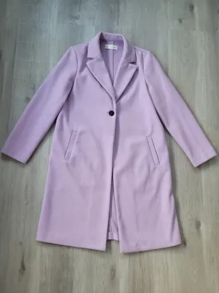 Elegante abrigo en tono rosa plata, perfecto para eventos especiales. Su diseño moderno y el tejido brillante lo hacen destacar. Como nuevo · L / 40 / 12 · Rosa y Plateado
