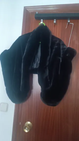 Bonito abrigo negro de pelo largo y suave. Cuello grande, tres botones delanteros. Corto, llega por la cintura. Nuevo, muy poco uso. Talla única, desde una 38 a 42 más o menos. Cómodo y calentito para el invierno. Ideal para vestir para una fiesta o para una ocasión especial. Moderno a la vez, si quieres ir más de ocasión.