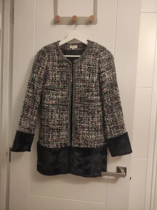 Elegante abrigo de fiesta de la marca COOSY con un diseño llamativo. - Tejido tweed multicolor con detalles brillantes. - Adornos de pelo sintético en puños y bajo. - Cierre de cremallera frontal. - Talla S (34/36). Da poca talla. - Solamente usado en una ocasión.