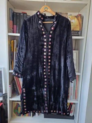 Elegante abrigo de terciopelo, ideal para eventos o entretiempo. - Diseño largo con detalles bordados y espejos. - Cuello mao. - Cierre frontal.
