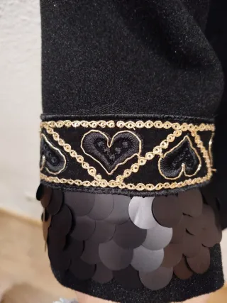 Elegante abrigo de fiesta con un diseño italiano único. Ideal para ocasiones especiales. - Color negro con detalles dorados. - Acabado con pedrería en los puños.