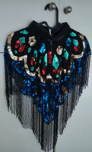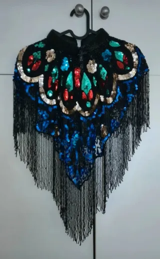 NO REBAJO EL PRECIO. Capa joya o pechera de pedrería o lentejuelas en base negra con detalles en color rojo, dorado, verde y azul. Ideal para eventos, fiestas o nochevieja. Nueva a estrenar.