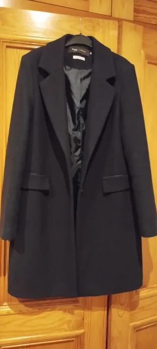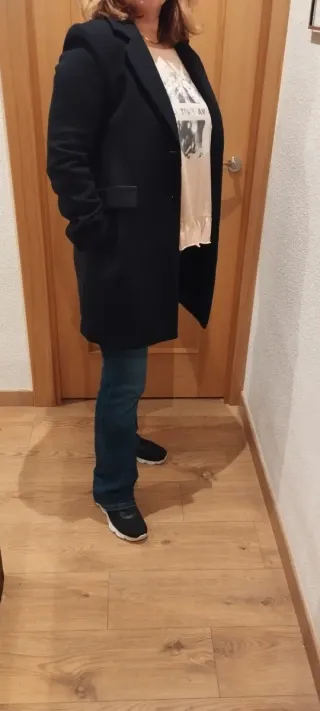 Abrigo de lana para mujer, azul marino, buena calidad, elegante, para la oficina o de fiesta. Puesto una vez. Se vende por cambio de talla. - Diseño clásico. - Bolsillos frontales con detalle. Bolsillos laterales funcionales. - Forro interior satinado. - Cierre en 2 botones.