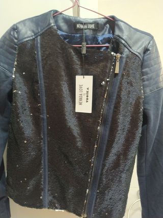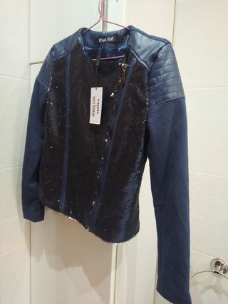 Chaqueta de Zara talla XS. De lentejuelas en tonos azul marino-gris-negro. Un solo uso.