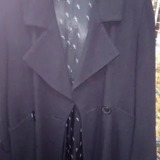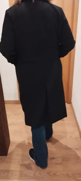 Abrigo semi largo de color negro de paño elegante, ideal para fiestas navidades o para el día a día. -apertura parte baja - Diseño clásico con solapas. - Dos botones decorativos en la parte trasera. - Cierre frontal.97cm de largo mangas 62cm 47cm sisa a sisa 42cm hombros