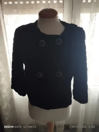 Rebeca de fiesta en color negro brillante. Un toque elegante para cualquier ocasión. - Diseño con botones frontales. - Tejido con textura. - Mangas largas. Es para protegerse solo un poco en una fiesta, no abriga porque la textura es semitransparente. Busca la foto donde está mi mano dentro del tejido. Sin olores ni roturas. Solo envío. ATENCIÓN: DICE TALLA M pero es más bien XS-S.
