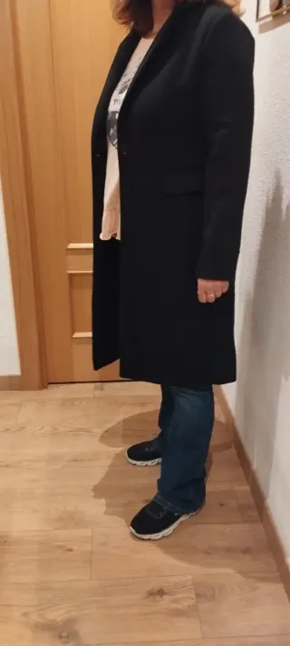 Abrigo largo de mujer en color negro. Un básico elegante para cualquier armario, para llevar con falda, pantalones, vestido, a la oficina o de fiesta. Puesto una vez. Se vende por cambio de talla. - Diseño clásico con solapa. - Cierre de un botón. - Bolsillos frontales. - Puños con detalle de botones. - Forro satinado.