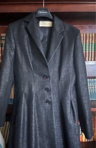Elegante abrigo largo de la marca Tintoreto. - Color negro. - Diseño clásico con solapas. - Cierre de botones. - Bolsillos frontales con detalle. - Puesto en dos ocasiones . - Pequeños brillos en el tejido que lo hacen para fiesta y cualquier ocasión. - Ver medidas