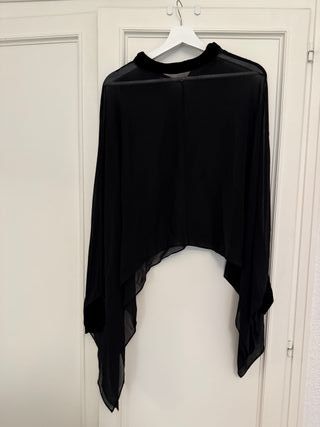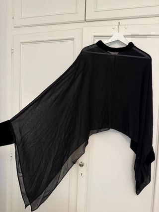 Elegante capa negra, ideal para eventos especiales o para añadir un toque sofisticado a tu atuendo. - Diseño asimétrico. - Tejido ligero y vaporoso. - Detalle en el cuello.