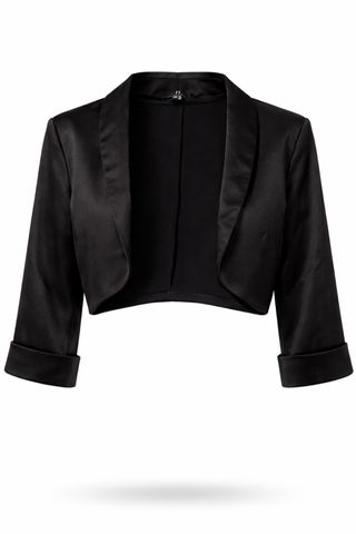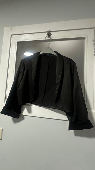 Elegante chaquetilla negra, ideal para eventos especiales. - Diseño corto y moderno. - Mangas largas. - Cuello con solapa.
