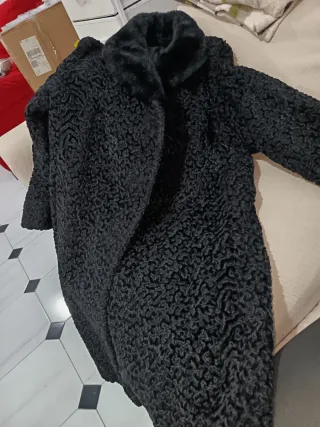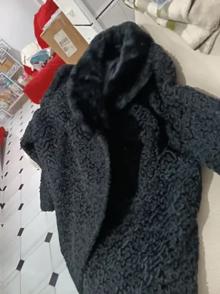 Bonito abrigo negro de pelo largo y suave. Cuello grande, tres botones delanteros. Corto, llega por la cintura. Nuevo, muy poco uso. Talla única, desde una 38 a 42 más o menos. Cómodo y calentito para el invierno. Ideal para vestir para una fiesta o para una ocasión especial. Moderno a la vez, si quieres ir más de ocasión.