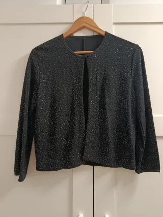 Chaqueta corta con lentejuelas brillantes. - Diseño de manga larga ( manga francesa ) - Cierre frontal. - es talla M pero válida para una talla S . - queda genial para vestidos de fiesta o incluso para noches especiales como para brillar en Navidad !! más ropa en mi perfil ! hago lotes y solo envío por Wallapop!!