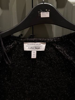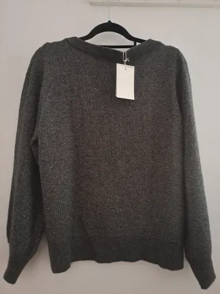 Jersey gris con brillo plateado, cuello barco y manga ligeramente abullonada. Queda muy bonito, abriga y es perfecto para fiestas. Talla XL que sirve una 44/46. Nuevo.