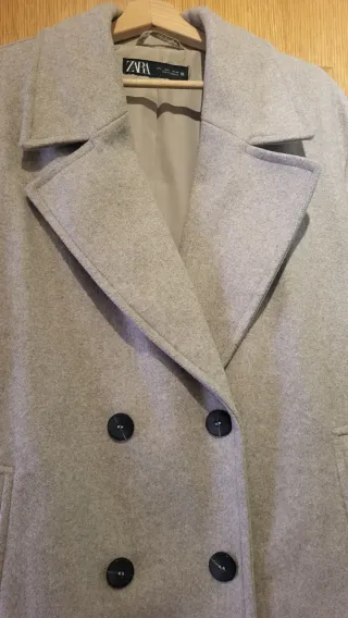Vendo abrigo largo de doble botonadura con cuello solapa. Talla L. (Es una L grande. Estilo oversize.) Marca Zara (etiqueta negra). - Dos bolsillos laterales. - Cierre de botones. - Diseño clásico y elegante. Medidas: - Largo: 124 cm - Pecho: 55 cm - Manga: 55 cm y (del cuello a muñeca 80cm ) - Ancho manga: 20cm - Ancho espalda:52 cm Ideal para estas fiestas Vendo por 25€
