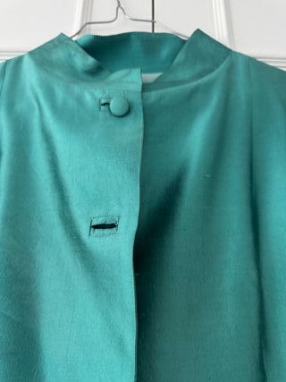 Chaqueta de seda de color verde agua o menta. Manga francesa o 3/4. Usada dos veces. Largo total 98cm. Pecho 100cm, cadera 116cm. Largo manga 46cm. Impecable. Para boda o evento. - Diseño elegante. - Manga tres cuartos. - Cierre de botones.