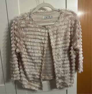 Chaqueta original y divertida con un diseño de flecos único. - Diseño de flecos en cascada. - Tacto suave y ligero. - Estilo moderno y llamativo. Es muy ligera Color rosa palo, rosa maquillaje Muy combinable. Ideal para las fiestas, cenas, salir