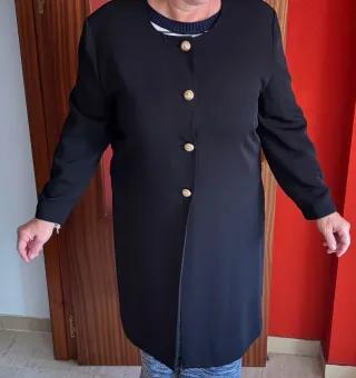 Elegante abrigo negro, ideal para eventos especiales. Su diseño clásico con botones dorados le da un toque sofisticado. - Cuello redondo. - Cierre de botones. - Manga larga. Medidas de axila a axila 56