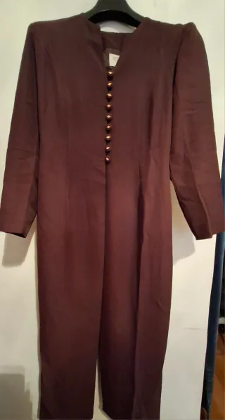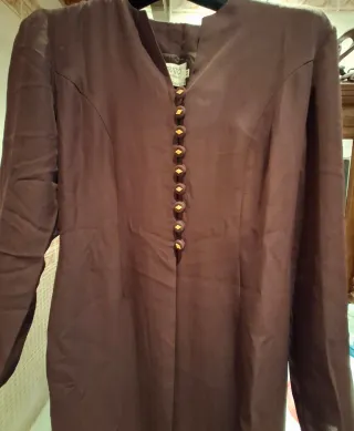 Elegante abrigo de fiesta en color marrón. Ideal para ocasiones especiales. - Diseño con cuello mao. - Cierre de botones dorados. - Manga larga. espalda 39 Contorno 45 Cintura 38 Largo 127