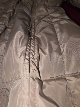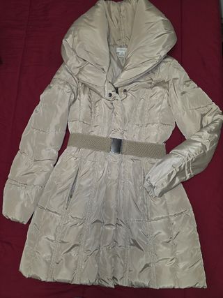 Abrigo de mujer con cuello y cinturón elástico. Muy calentito y fácil de limpiar. Bolsillos con cremallera. Observación: tiene un pequeño descosido en uno de los bolsillos pero no afecta a su funcionalidad