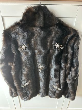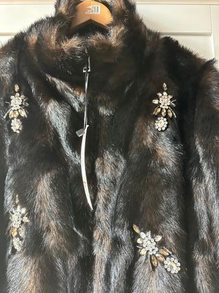Elegante abrigo de fiesta de Zara. - Diseño con detalles de pedrería. - Pelo - Color marrón. -Cierre con cremallera. Nunca usado. Corto tipo cazadora. Precio original 90 euros.