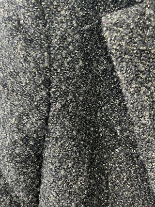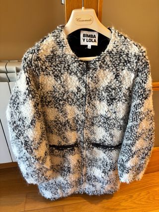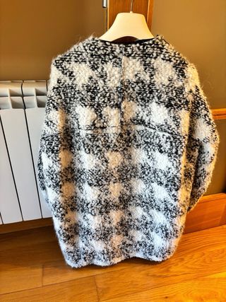 Chaquetón de lana con un diseño texturizado en blanco y negro. - Cuello redondo. - Cierre de cremallera. - Dos bolsillos frontales con detalle de cremallera. -En tejido bouclé de efecto rizo muy suave y abrigado. Estampado en tonos blanco y negro. -Composición: 55% poliéster, 28% lana y 17% poliacrílico, mezcla ideal para abrigar sin resultar pesada. Fue un regalo y lo puse en una única ocasión.