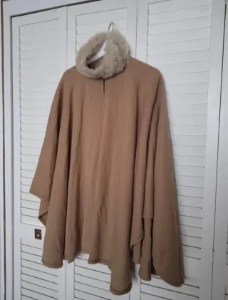 Poncho de lana color camel con cuello de pelo sintético. Estilo elegante y cálido, perfecto para el otoño e invierno. Este poncho de talla única se adapta fácilmente a diferentes tipos de cuerpo, brindando comodidad y estilo. El material de lana garantiza calidez y suavidad, mientras que el detalle del cuello de pelo añade un toque de lujo y sofisticación. Ideal para combinar con prendas casuales o más formales. Usado, pero en buen estado, sin defectos visibles. Perfecto para completar tu look de temporada o como regalo.