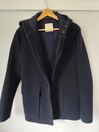 Abrigo de paño azul marino de Mango con diseño moderno y capucha. Lana y poliéster. Muy poco uso. Precio original 79€ - Cierre de cremallera y botones. - Bolsillos frontales. - Forro interior. - Capucha integrada.