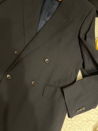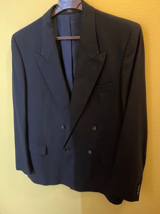 Elegante chaqueta de traje para hombre, de color azul marino - En perfecto estado, como nueva. Sin apenas uso. - Pura lana virgen. Confección de alta calidad. - Diseño de doble botonadura. - Bolsillos frontales e interiores - Puños con botones.
