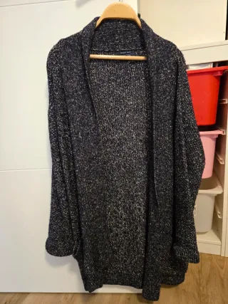 Chaqueta larga de punto con un diseño jaspeado en tonos oscuros y claros. Es una prenda cómoda y versátil. - Tejido de punto grueso. - Algodon 65% lana 22% acrílico 10% y poligamia 3% - Corte abierto. - Manga larga.