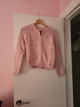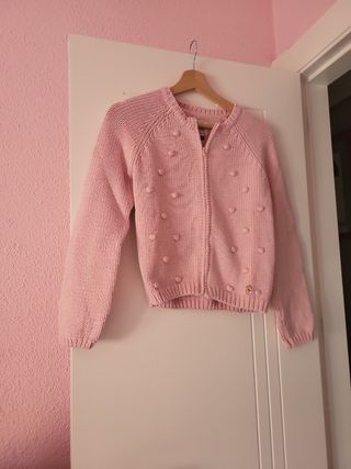 Chaqueta preciosa . La talla es 44 ò 46 . Está tricotada a mano , con muy pocas puestas, está como nueva. Es muy calentita ,ancha y bastante larguita. , El color es azul y con dibujos ,como estrellas , d color rosa claro y rosa mas fuerte...preciosa Está tejida mano con lana muy buena Se puede llevar encima d una camisa o jersey REBAJADA 25 abril. 2025