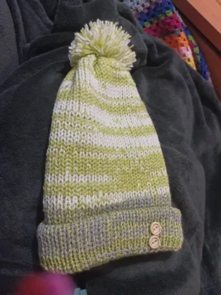 Gorro de lana tejido a mano, perfecto para mantenerte abrigado con estilo. - Diseño a rayas en verde y blanco. - Pompón en la parte superior. - Detalle de dos botones de madera en el borde.