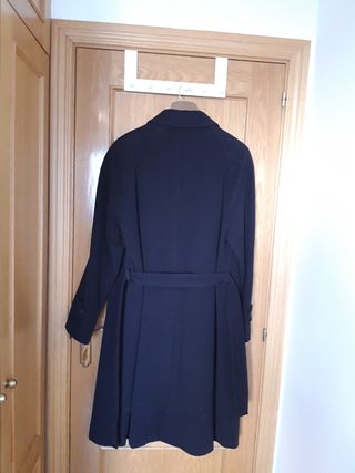 Abrigo azul marino, 80 % de lana, con forro desmontable en color camel, con cinturón y bolsillos con tapeta, largo de 95 cms, talla 48.