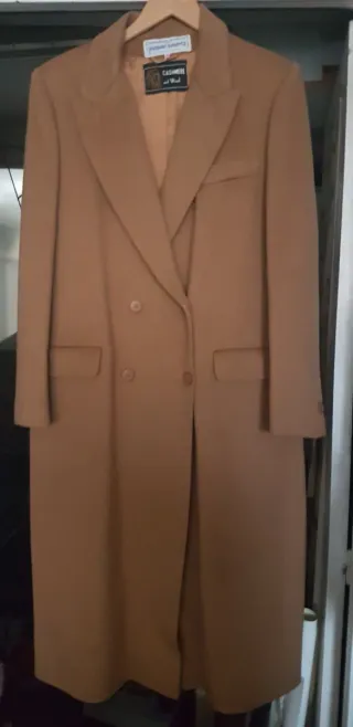 Elegante abrigo largo de lana en color camel. Un clásico atemporal. 100% Lana - Diseño de doble botonadura. - Dos bolsillos frontales. - Cuello solapa. Ligeros desgastes en la lana, imperceptibles una vez puesto el abrigo.
