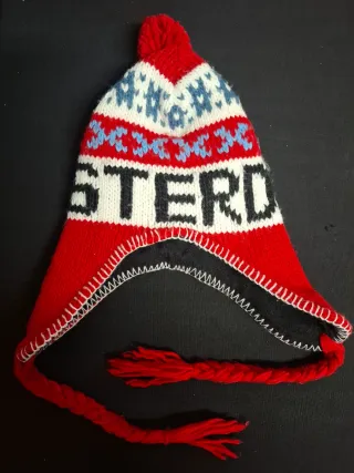 Gorro de lana tejido a mano con un diseño colorido y un pompón en la parte superior. Ideal para mantenerte abrigado con estilo. - Diseño con letras RDAM y patrones geométricos. - Orejeras con cordones y borla. - Costuras decorativas en blanco.