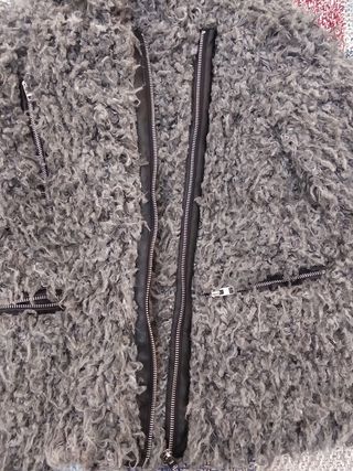 Chaquetón mujer de lana rizada color gris. Cierre delantero con cremallera negra. Con 2 bolsillos delanteros de cremallera. Marca Sfera. Talla M. Buen estado.
