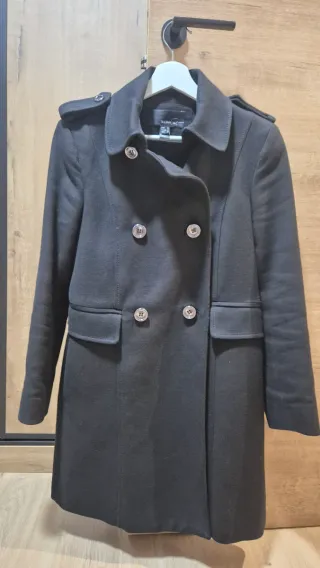 Elegante abrigo largo de Mango, perfecto para el día a día. - Diseño de doble botonadura. - Cuello solapa clásico. - Bolsillos frontales. - Hombreras decorativas. Abrigo negro Mango talla M . 15% lana, 85% algodon.